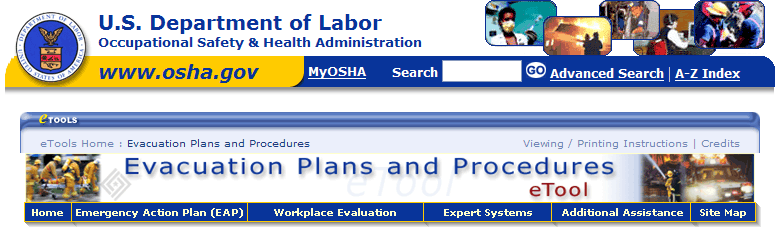 The Occupational Safety and Health Administration (OSHA) has an electronic e-tool that can assist facility managers with developing an evacuation plan. It can be accessed at: http://www.osha.gov/SLTC/etools/evacuation/index.html (this link opens in a new window)